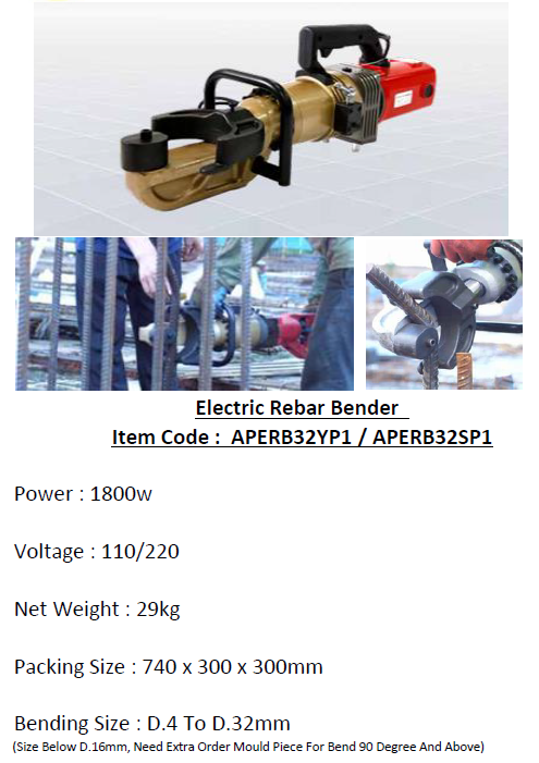 Electric Rebar Bender Electric Rebar Bender: S$2235.00/unit. Share this: Click to share on X (Opens in new window) X Click to share on Facebook (Opens in new window) Facebook Like Loading...